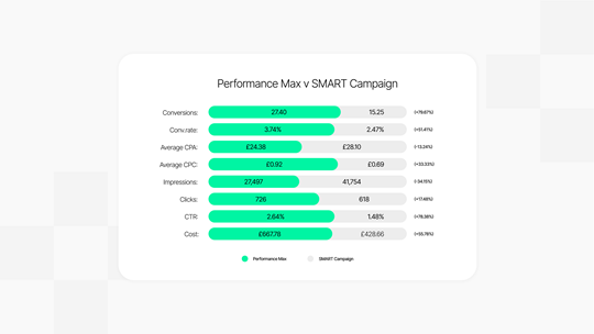 After trialing the Performance Max campaign with a client of ours we saw leads increased, average CPA (cost per acquisition) decreased and average CTR (click through rate) increased significantly in comparison to a co-running SMART campaign. The impressive results can be seen below: