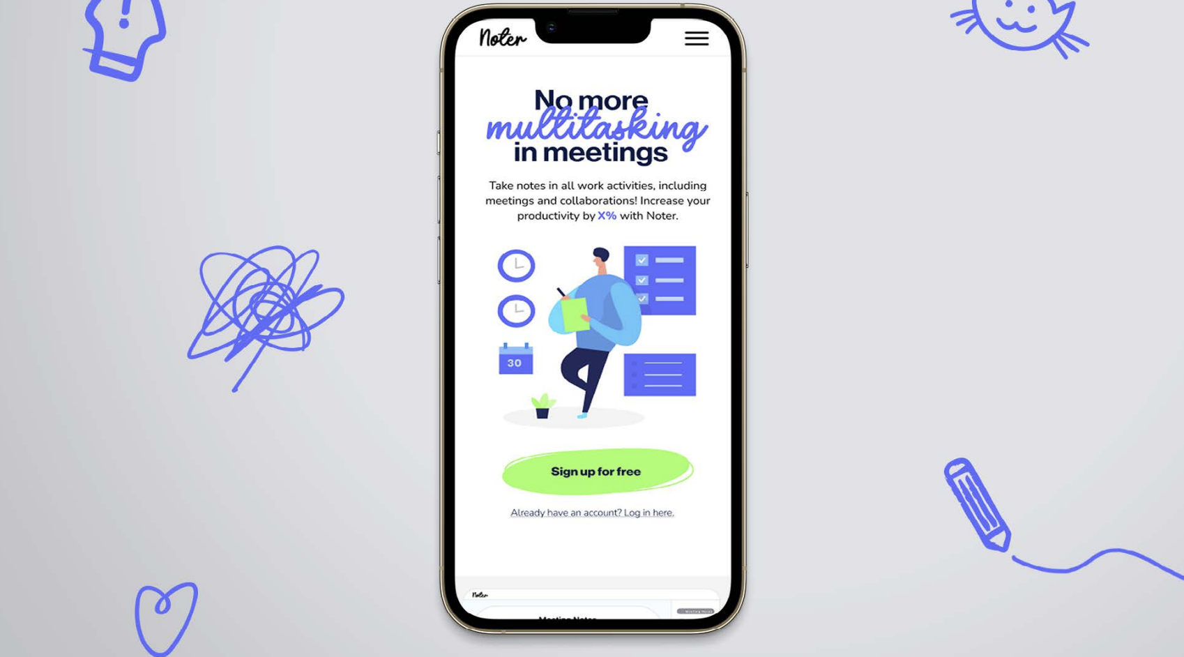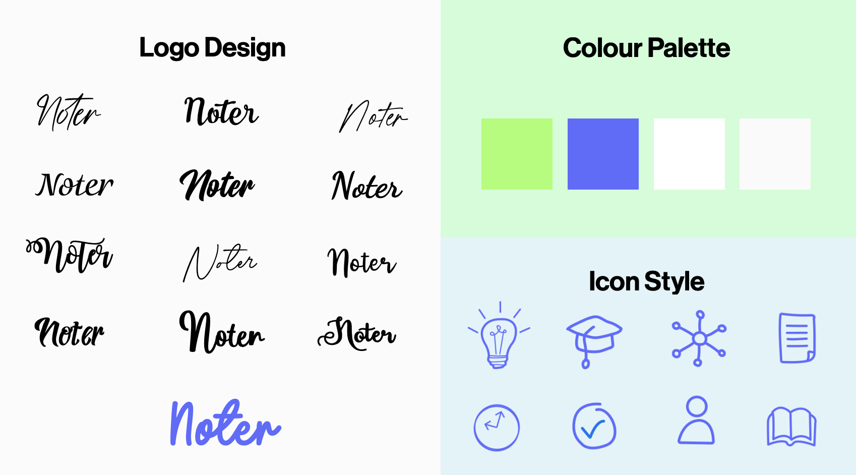 I was responsible for creating the Noter brand and designing the website. I wanted it to still have that handwritten feel like you would have when using a pen and paper. Still in keeping with that playful hand-drawn feeling, I designed icons in that style for the website. Once the website was designed, Casey took my prototype through to User Testing, which resulted in a user-tested and updated design which we presented back to the wider team. I was terrified for the presentation, I’d never had to do anything like that before but once I got talking I felt relaxed.